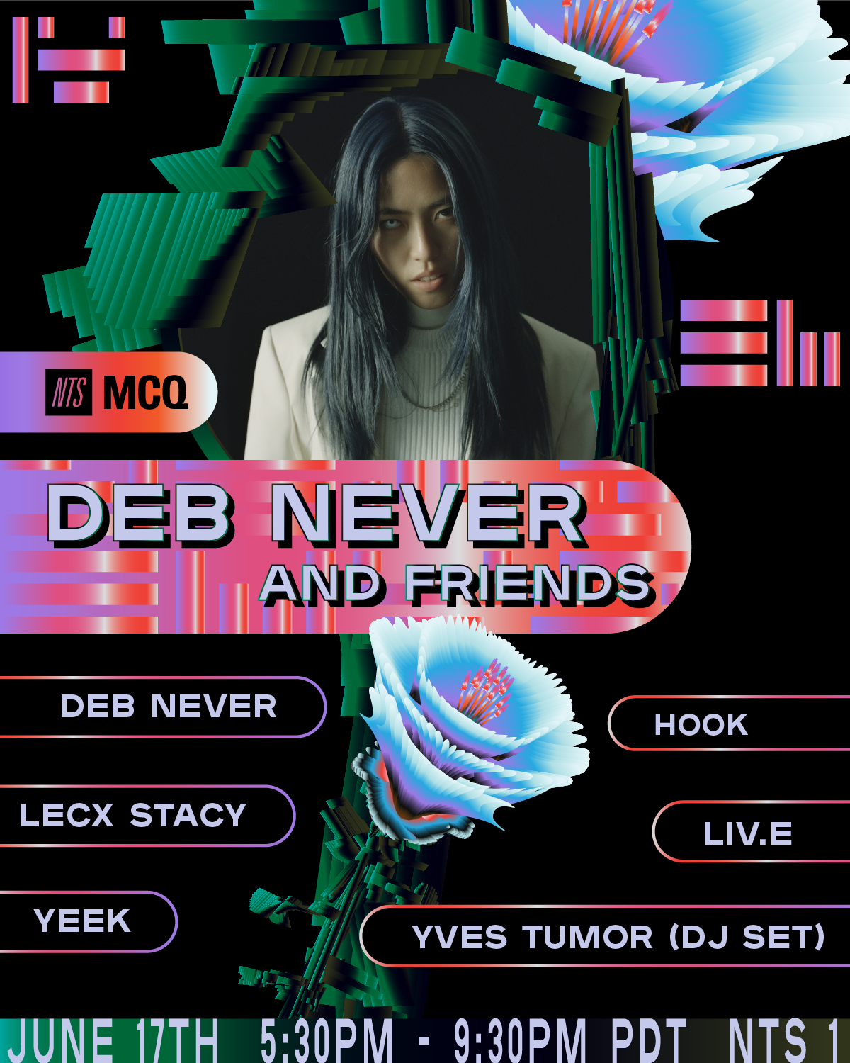 Event identity & design for Deb Never & Friends hilltop event in Los Angeles presented by NTS Radio and MCQ. Deliverables include lineup flyers, website static assets, static & animated social content, video titles for Youtube, DJ Booth & Bar vinyl graphics, golfcart stickers, etc.